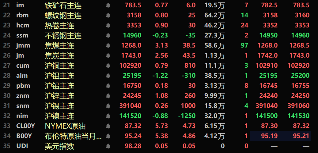黑色系多飘红,铁矿涨0.77%,螺纹涨0.8%,热卷涨0.9%,不锈钢涨跌0.23%。双焦方面:焦煤主力合约涨3.13%,焦炭主力合约涨2.56%。