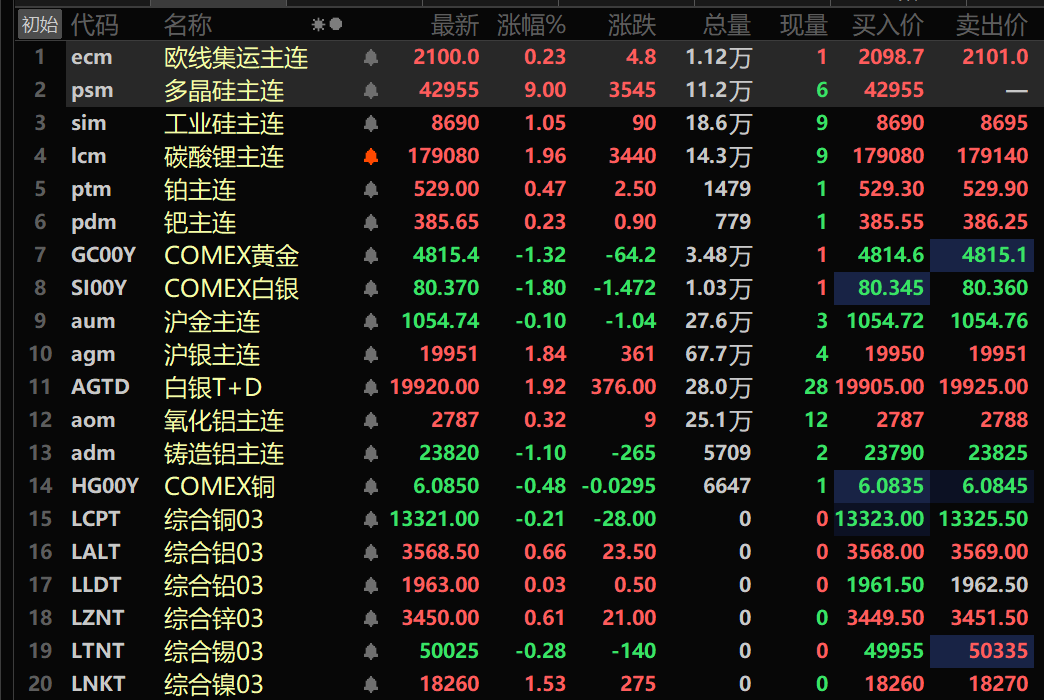 此外,铸造铝主连期货跌1.1%,氧化铝主连涨0.32%。碳酸锂主连涨1.96%。工业硅主连涨1.05%。多晶硅主连以9%的涨幅涨停。