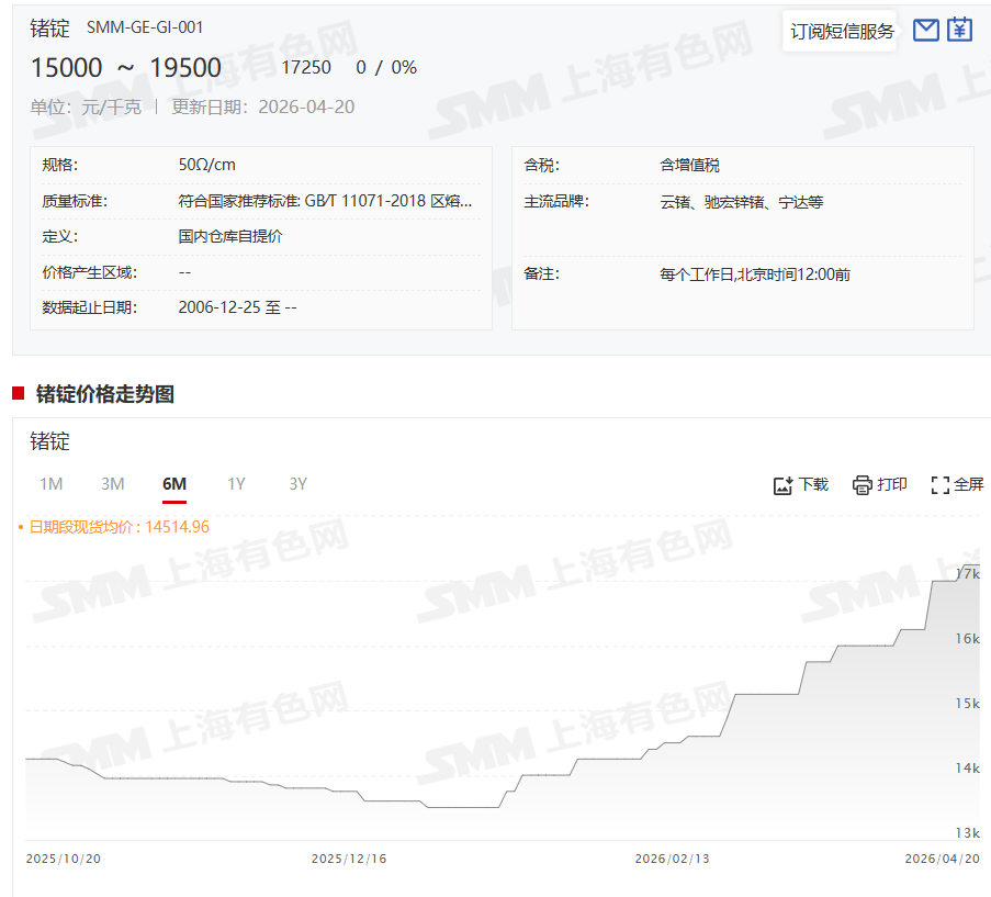 受原料供应偏紧影响,锗价的重心整体出现了上移。4月20日,SMM锗锭的价格为15000~19500元/千克,其均价为17250元/千克,较前一交易日持平。而20日的均价17250元/千克较其1月14日的低点13500元/千克,3个多月的时间里上涨了3750元/千克,涨幅为27.77%。