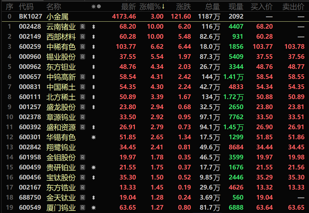 受原料供应偏紧影响,锗价3个多月的时间里涨逾27%;而部分分离厂停产给稀土带来供应端口的支撑,叠加下游企业库存降至低位,下游的补库需求等均支撑稀土价格续涨;AI 算力、半导体、机器人等终端需求爆发也给小金属板块带来需求向好的预期,叠加部分市场资金的流入等均带动小金属板块连续三个交易日持续上行,截至4月20日收盘,小金属板块涨3%,个股方面:云南锗业、西部材料涨停,中稀有色、锡业股份、东方钽业、中钨高新、中国稀土以及北方稀土等涨幅居前。