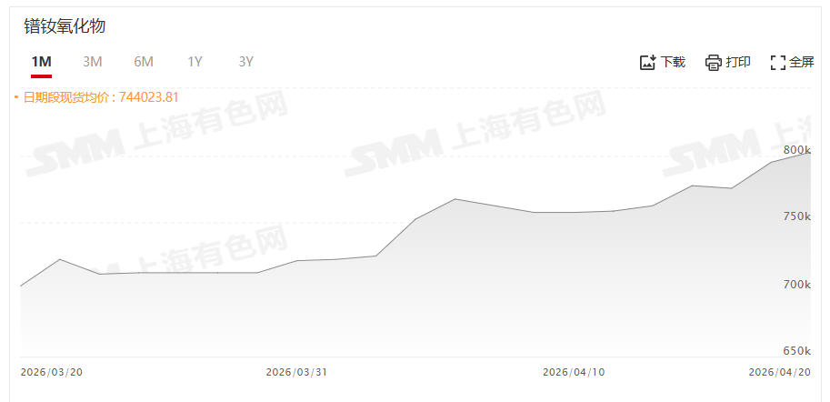 现货市场方面,氧化镨钕价格近两个交易日持续走强。4月20日,氧化镨钕价格报800000~805000元/吨,其均价为802500元/吨,较其前一交易日涨0.94%。受部分分离厂停产带来的供应偏紧预期,上游持货商挺价惜售心理较强,而下游企业目前处于库存低位状态,稀土价格反弹,带来了部分补库需求进场,进而支撑稀土价格继续上涨。随着氧化镨钕的均价再次升至80万元/吨上方,市场观望情绪逐渐升温,而下游磁材企业对高价金属接受程度有限,采购积极性出现下降。预计短期内,受上游挺价信心充足的影响,镨钕产品价格或将维持高位震荡态势。