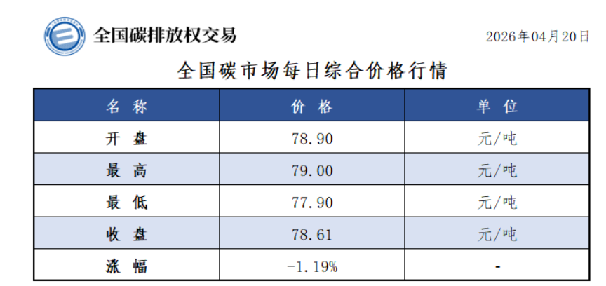 今日全国碳市场综合价格行情为: 开盘价78.90元/吨,最高价79.00元/吨,最低价77.90元/吨,收盘价78.61元/吨,收盘价较前一日下跌1.19%。