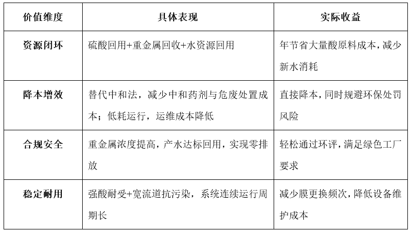 酸回用:产液硫酸纯度优异,直接回用于浸出、酸洗等工序,减少新酸采购。
