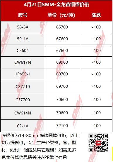 【SMM价格】2026年4月21日金龙黄铜棒价格