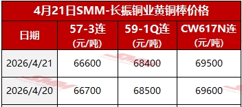 【SMM价格】2026年4月21日长振黄铜棒价格