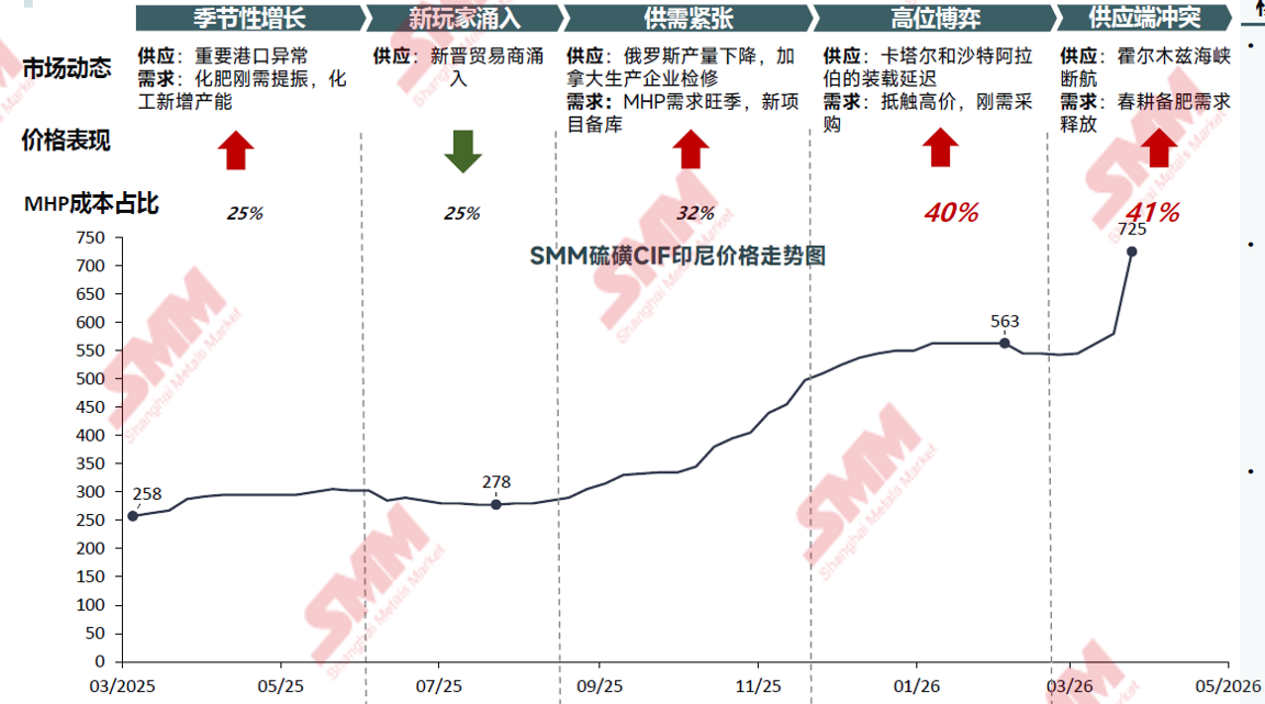 截至2026年3月,硫磺在MHP的成本构成中,已从2022年的22%的占比提升至42%的占比,对MHP成本影响明显。