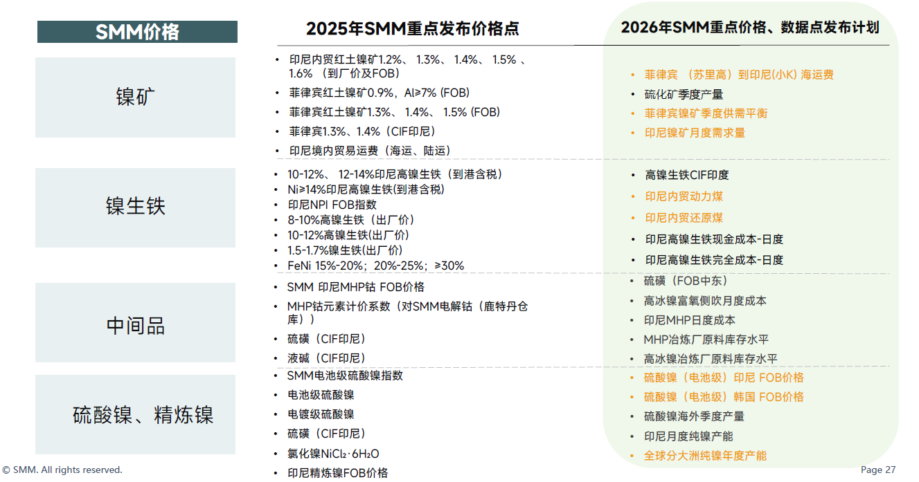 短期内,预计2026年,硫磺价格仍有上行空间。中长期而言,新兴需求领域, SMM预测2030年全球磷酸铁锂产能达1300万吨,全球MHP产能达139.43万镍吨。镍中间品关注印尼RKAB配额政策及新MHP项目产能释放情况,储能领域关注装机出货量增速及新磷酸铁锂项目产能释放情况。