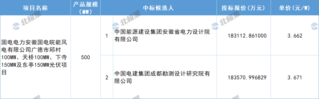 4月21日,国电电力安徽国电皖能风电有限公司广德市邱村100MW、天桥100MW、下寺150MW及东亭150MW光伏项目EPC总承包公开招标中标候选人公示,第一中标候选人为中国能源建设集团安徽省电力设计院有限公司,单价3.662元/W。