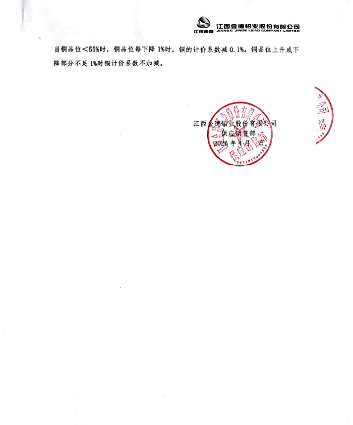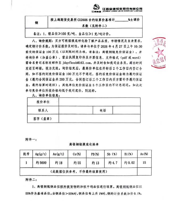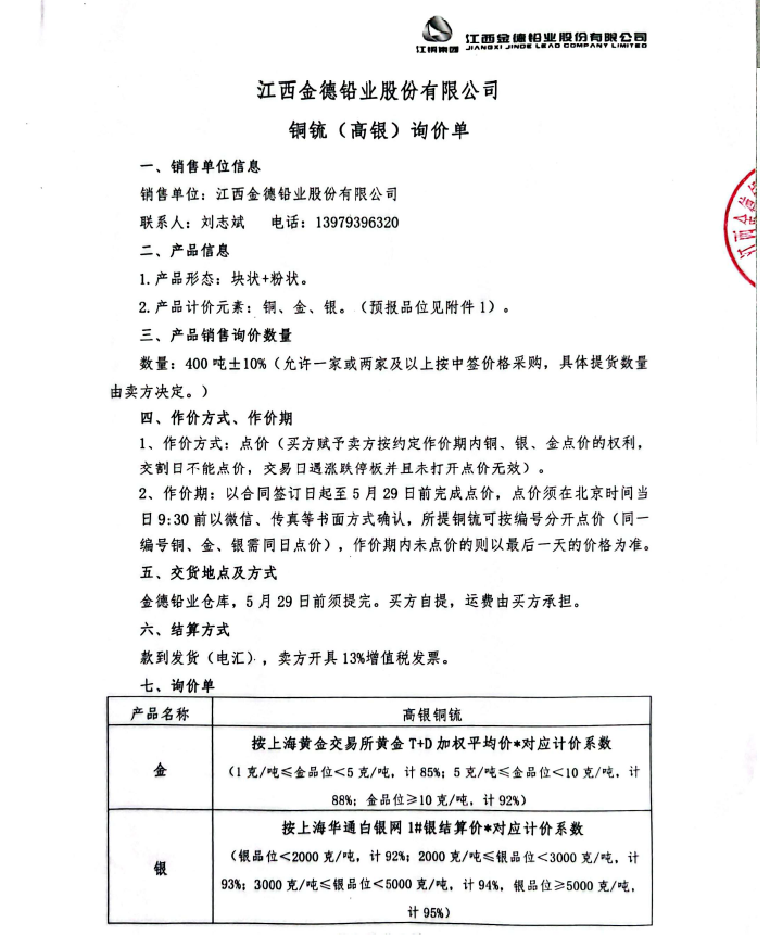 近期,江西金德铅业股份有限公司发布江西金德铅业股份有限公司铜锍(高银)询价单,销售数量为400吨士10%((允许一家或两家及以上按中签价格采购,具体提货数量由卖方决定)。询价规则为买方可根据自行取摸底样化验了解产品品质、市场情况及自身要求,确定铜计价系数。