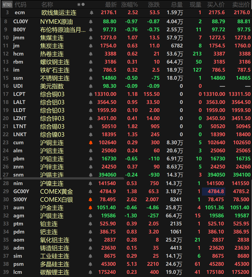 此外,碳酸锂主连涨0.23%,工业硅主连涨0.29%,多晶硅主连涨5.13%。欧线集运主连涨2.52%报2176.1。
