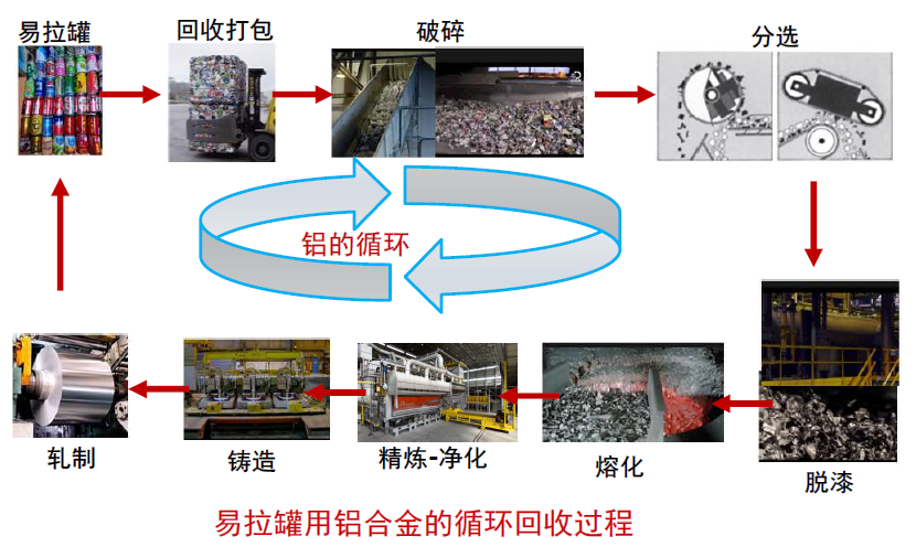 不同种类的铝制品 脱漆与其他材料的组合程度不同,回收过程中的主要流程存在较大差异,易拉罐的收集、分选和脱漆和高效重熔是关键环节。