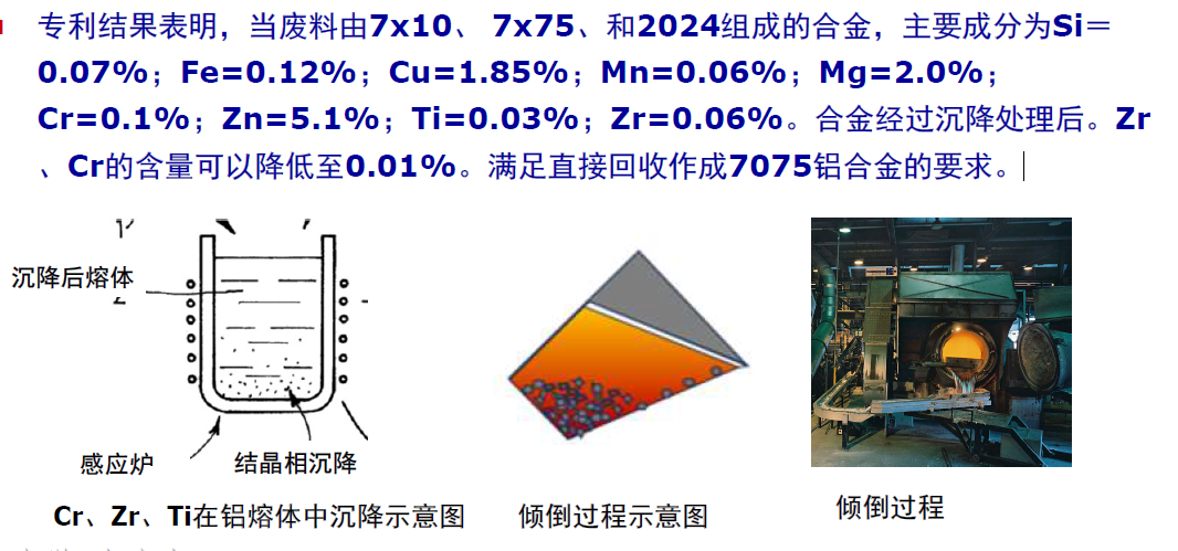 2001年美国专利给出了去除2、7xxx合金废料中的Cr、Zr、Ti等元素技术。利用形成初生相的沉降,将元素沉降到熔体的底部。通过倾倒分离上层更“纯净”的熔体。
