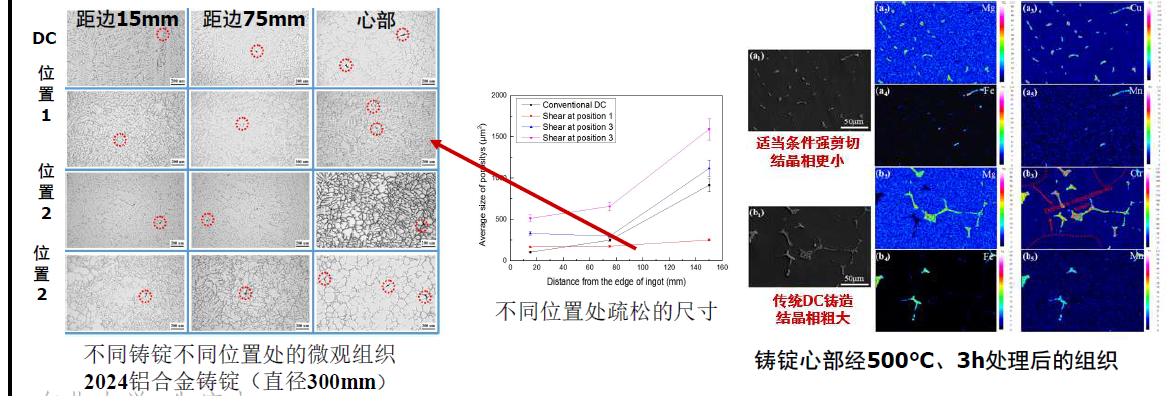 为了追求效率和成材率竖直DC铸造扁锭的厚度越做越大;但这会带来一系列问题,如开裂,内部组织粗大等问题,特别不利于再生铝结晶相的尺寸的控制。