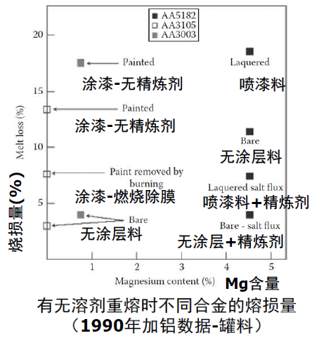 表面涂漆或喷漆的铝合金在直接放入熔炼炉内进行熔炼,会造成烧损,这些烧损与合金中的Mg含量以及是否进行溶剂保护有关。