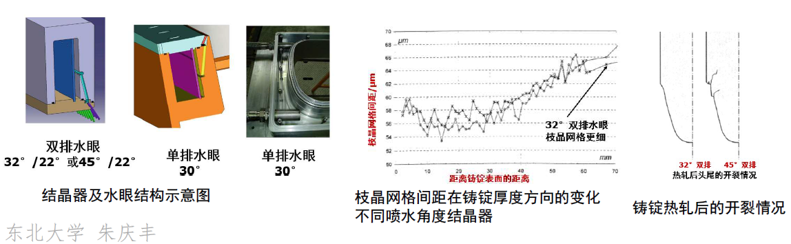 2014年肯联铝业提出了新的水眼的角度,将双排水眼喷射角度的45°换成了32°。研究发现32°双排水眼的DC过程中铸锭的热裂倾向和翘曲量更小,锭坯端部轧制后不容易开裂。32°水眼铸锭心部的枝晶网格间距更小(结晶相对相应的更小)。