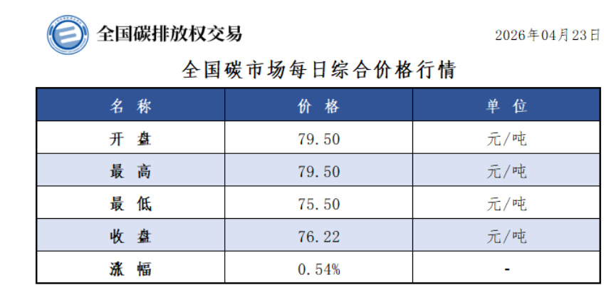 今日全国碳市场综合价格行情为: 开盘价79.50元/吨,最高价79.50元/吨,最低价75.50元/吨,收盘价76.22元/吨,收盘价较前一日上涨0.54%。