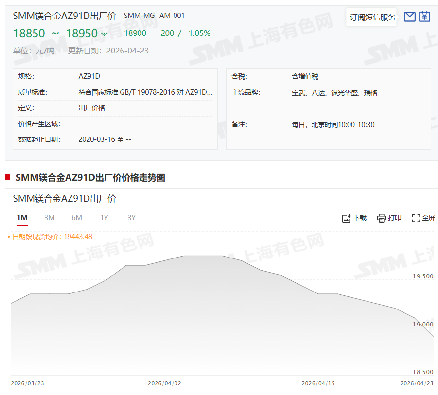 SMM镁合金AZ91D出厂价4月23日的价格为18850~18950元/吨,其均价为18900元/吨,与前一交易日跌1.05%。近来,受近日镁价呈现“倒V”运行走势影响,镁合金的价格表现也相应偏弱。