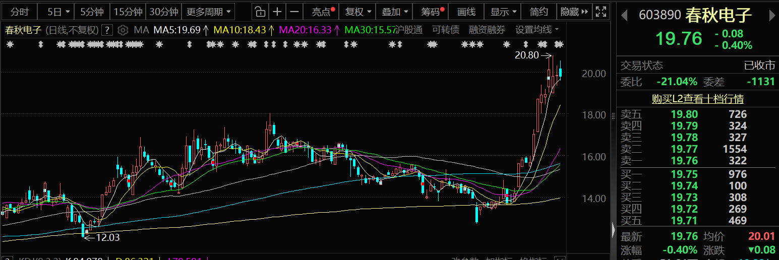 4月23日,春秋电子股价出现下跌,截至23日收盘,春秋电子跌0.4%,报19.76元/股。