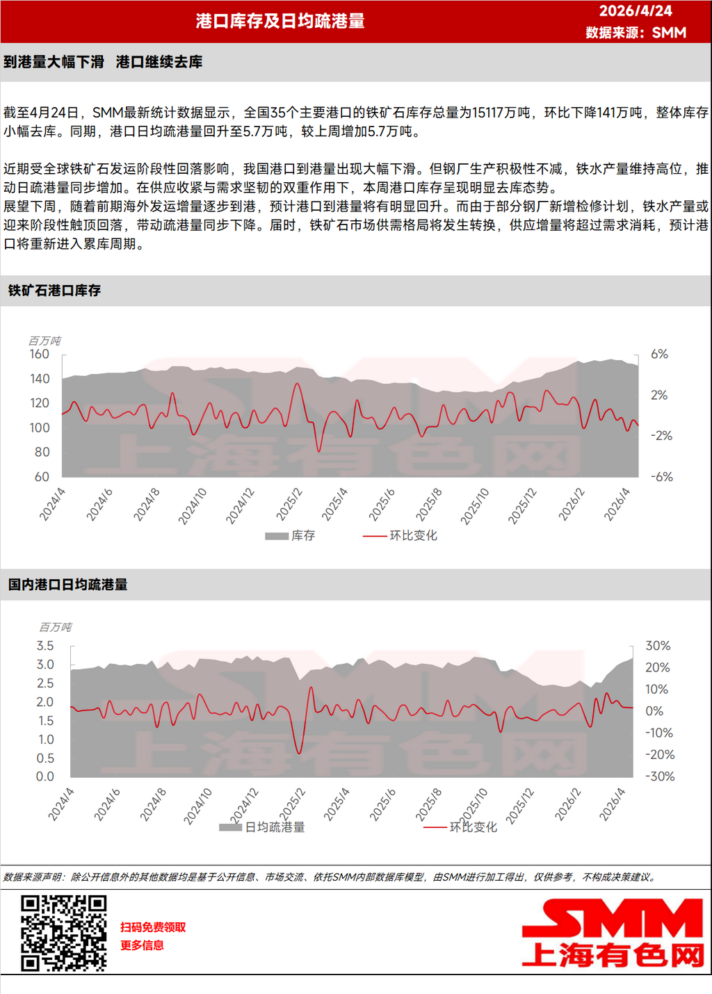 截至4月24日,SMM最新统计数据显示,全国35个主要港口的铁矿石库存总量为15117万吨,环比下降141万吨,整体库存小幅去库。同期,港口日均疏港量回升至5.7万吨,较上周增加5.7万吨。