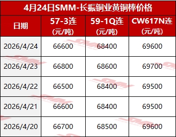 【SMM价格】2026年4月24日长振黄铜棒价格