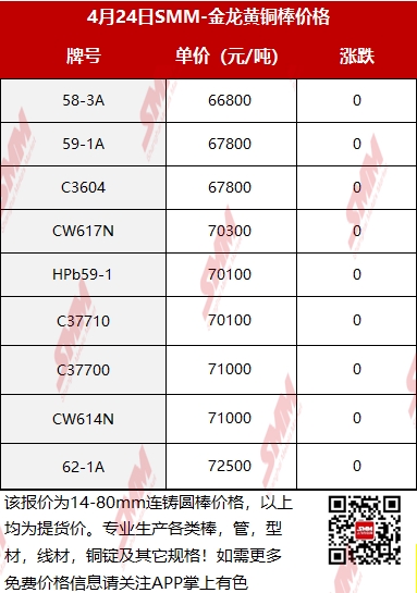 【SMM价格】2026年4月24日金龙黄铜棒价格