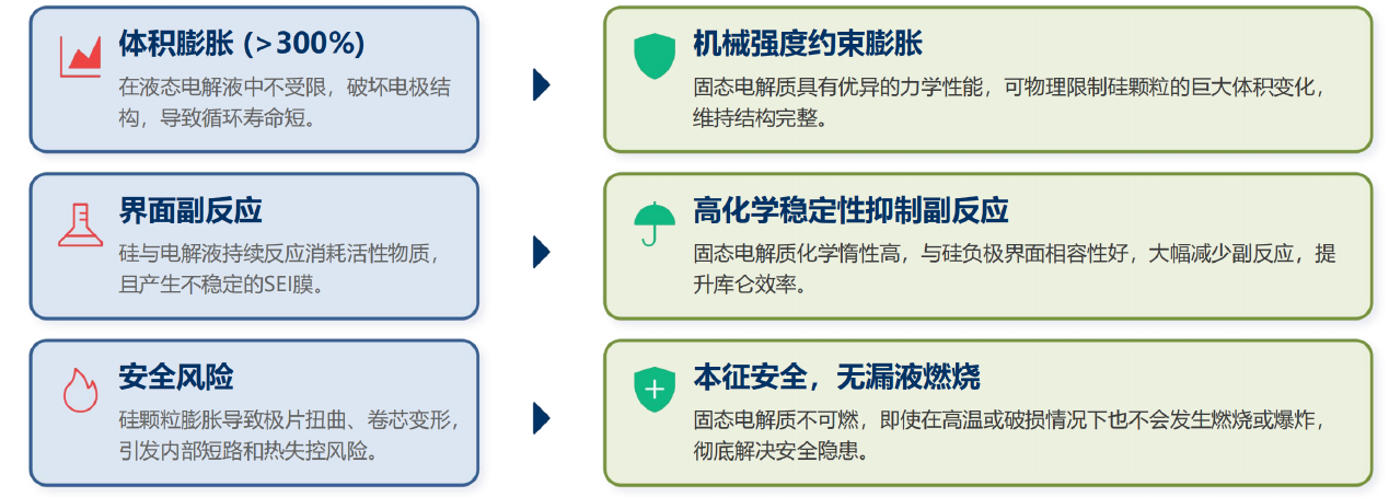 固态电池不是硅碳负极应用的“挑战者”,而是“护航者”,可以有效规避体积膨胀、界面副反应与安全风险。
