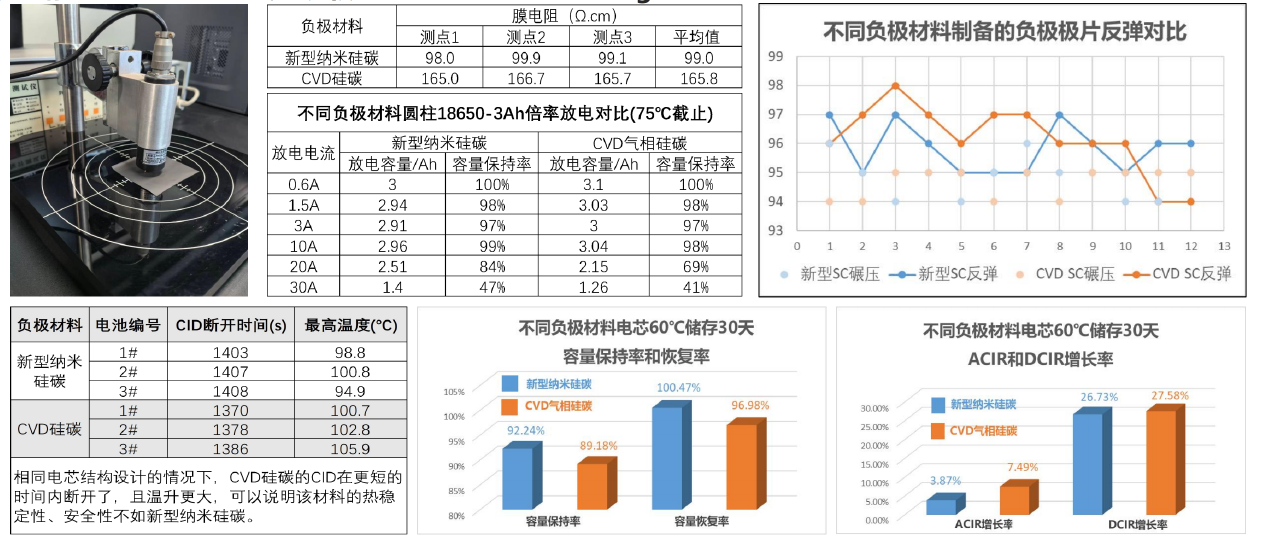 安全可靠性:电池CID断开时温升小,时间长,以及结合高温储存的容量和阻抗表现来看,新型纳米硅碳更优。