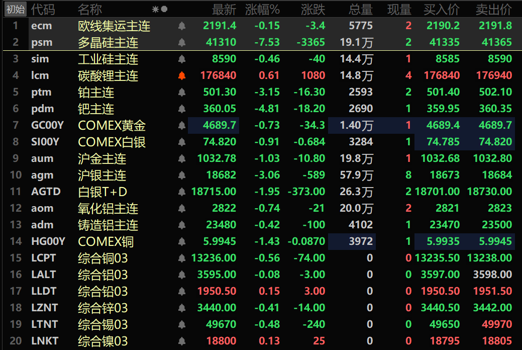 此外,铸造铝主连期货跌0.42%,氧化铝主连跌0.74%。碳酸锂主连涨0.62%。工业硅主连跌0.46%。多晶硅主连期货跌7.53%。