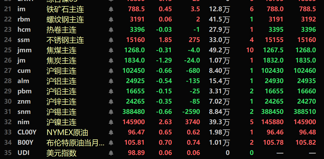 黑色系涨跌互现,铁矿涨0.45%,螺纹微涨,热卷微跌,不锈钢涨1.85%。双焦方面:焦煤主力合约跌0.31%,焦炭主力合约跌1.29%。