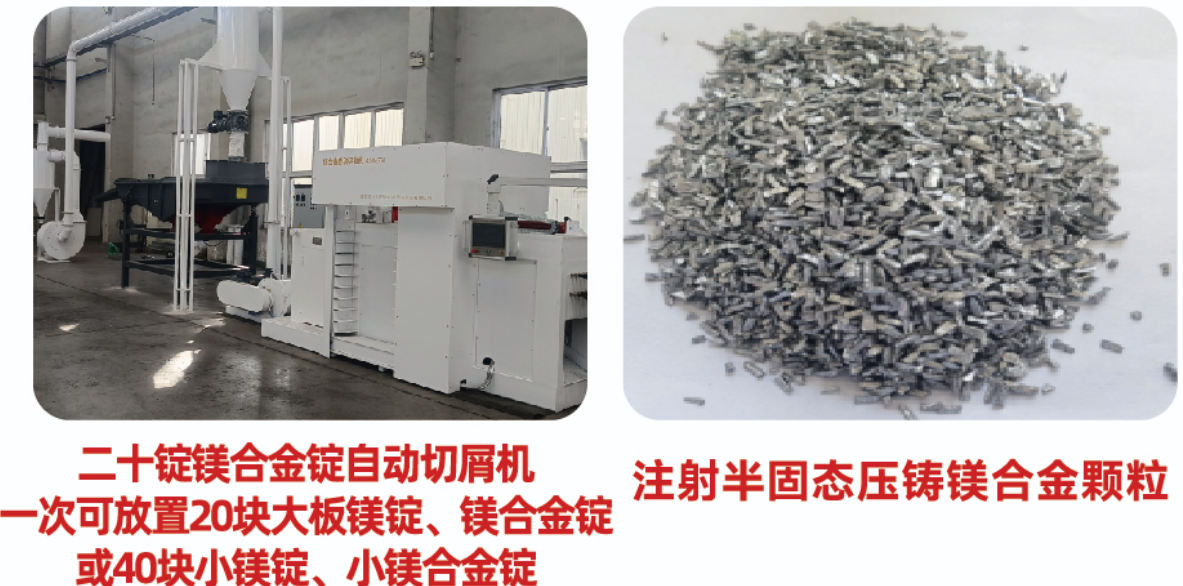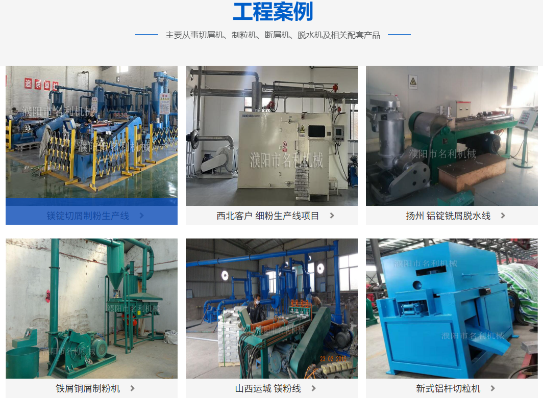 二十多年来,公司针对镁、镁合金锭、铝、铜、铁、钙、锌、钛、锡等金属冷加工切屑、制粒、制粉工艺需求,先后研发了几十种性能优越、技术先进专利新产品,如有色金属粉碎机设备,制粒、制粉机设备,机内刀片可调,可控颗粒大小,产量大小。产品有制粒、制粉机卧式型号:M600型、M600B型、M700型、M700S型、M800型、M800S型、M900型、M1300型、VI-900型立式、球磨机等成套设备,金属镁、镁合金制粉压球储氢设备,半固态注射压铸镁合金锭切粒机设备,各种金属材料破碎筛分除尘设备,锂电池回收破碎筛分处理设备。