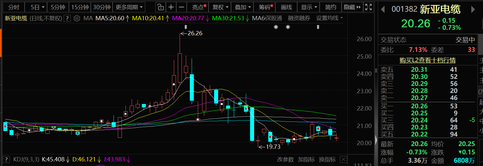4月24日,新亚电缆的股价出现下跌,截至24日14:32分,新亚电缆跌0.73%,报20.26元/股。