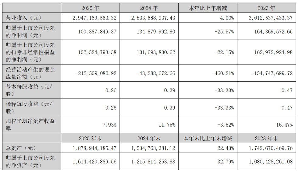 新亚电缆4月20日披露年报,2025年实现营业收入29.47亿元,同比增长4.00%;归母净利润1亿元,同比下降25.57%。,归属于股东净利润下降的主要原因:一是电线电缆市场竞争加剧及原材料铜、铝价格持续攀升,导致公司综合毛利率承压;二是公司应收账款规模扩大,导致信用减值损失计提金额增加;三是期间费用增加,主要系公司加大市场开拓力度而相应增加费用开支,以及支付上市相关费用所致。