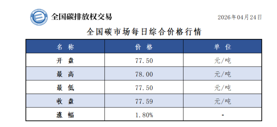 今日全国碳市场综合价格行情为: 开盘价77.50元/吨,最高价78.00元/吨,最低价77.50元/吨,收盘价77.59元/吨,收盘价较前一日上涨1.80%。