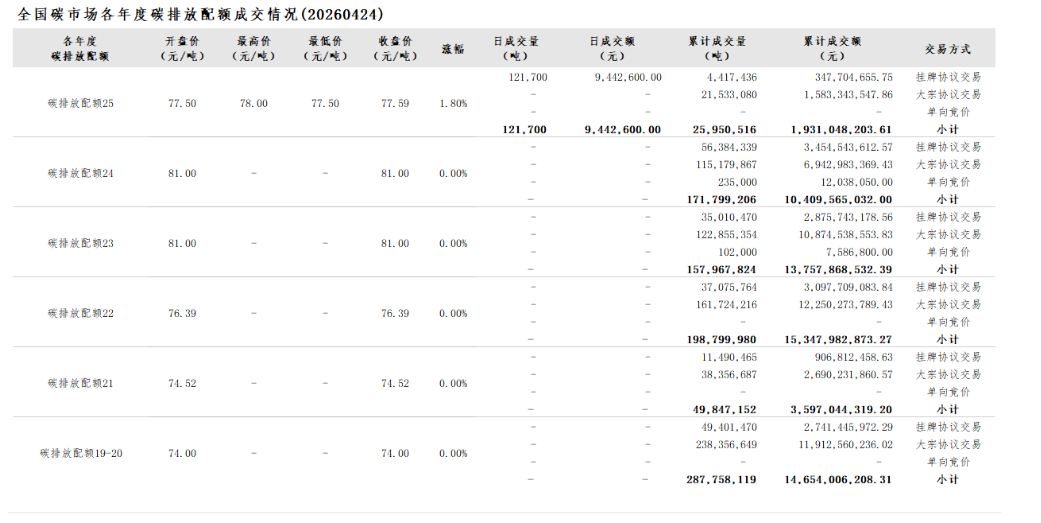 2026年1月1日至4月24日,全国碳市场碳排放配额成交量27,256,277吨,成交额2,034,896,937.21元。