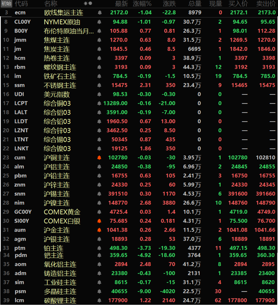 隔夜黑色系方面普涨,仅铁矿唯一下跌,跌幅达0.19%。不锈钢涨2.31%,其余金属涨幅均小幅波动,双焦方面,焦煤涨0.63%,焦炭涨0.46%。
