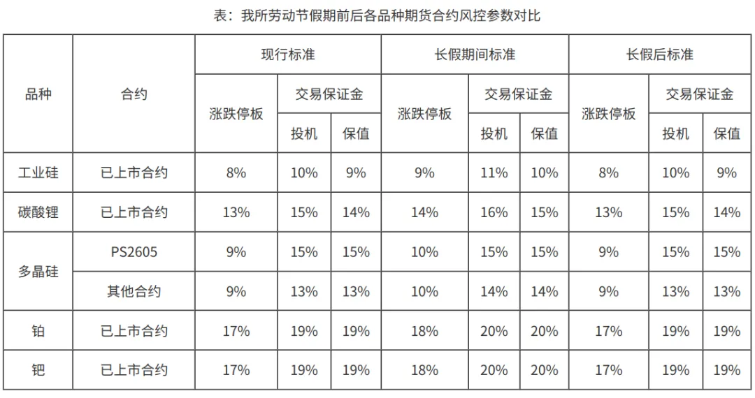 根据《广州期货交易所风险管理办法》,经研究决定,交易所将在2026年劳动节假期休市前后对各品种期货合约涨跌停板幅度和交易保证金标准做如下调整: