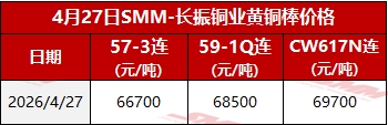 【SMM价格】2026年4月27日长振黄铜棒价格