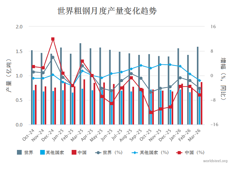 据世界钢铁协会对69个国家的统计,3月份,世界粗钢产量为1.599亿吨,同比下降4.2%。前三个月产量为4.592亿吨,同比下降2.3%。