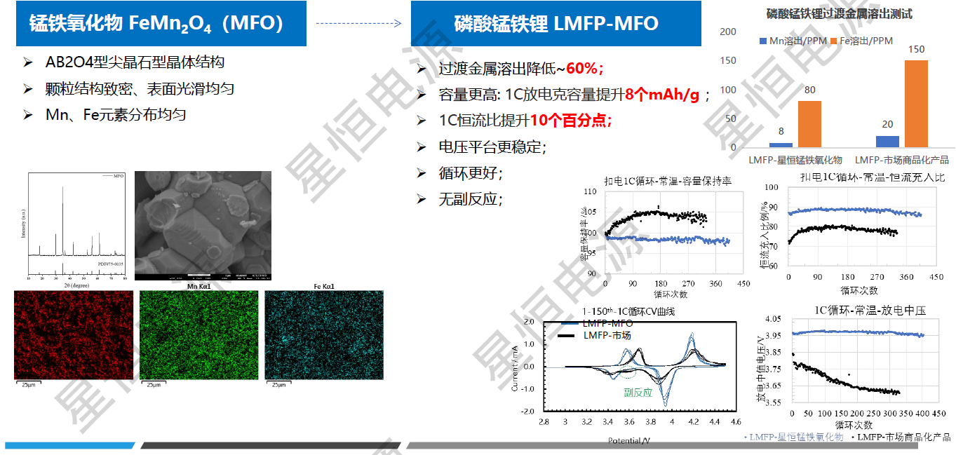 星恒独创固相法合成锰铁氧化物(MFO),以硫酸亚铁、硫酸锰等原料,通过高温固相法合成锰铁氧化物,将锰和铁离子均匀分布在晶格中;以其作为前驱体合成的磷酸锰铁锂材料,导电性高、电压平台稳定、循环性能优异。已获得中、日、韩三国发明专利授权。