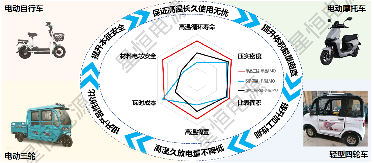 基于单晶三锰-LMO制备的锰基电池六大维度全面领先,兼顾安全、能量、寿命、成本,为小动力电池提供无短板方案。