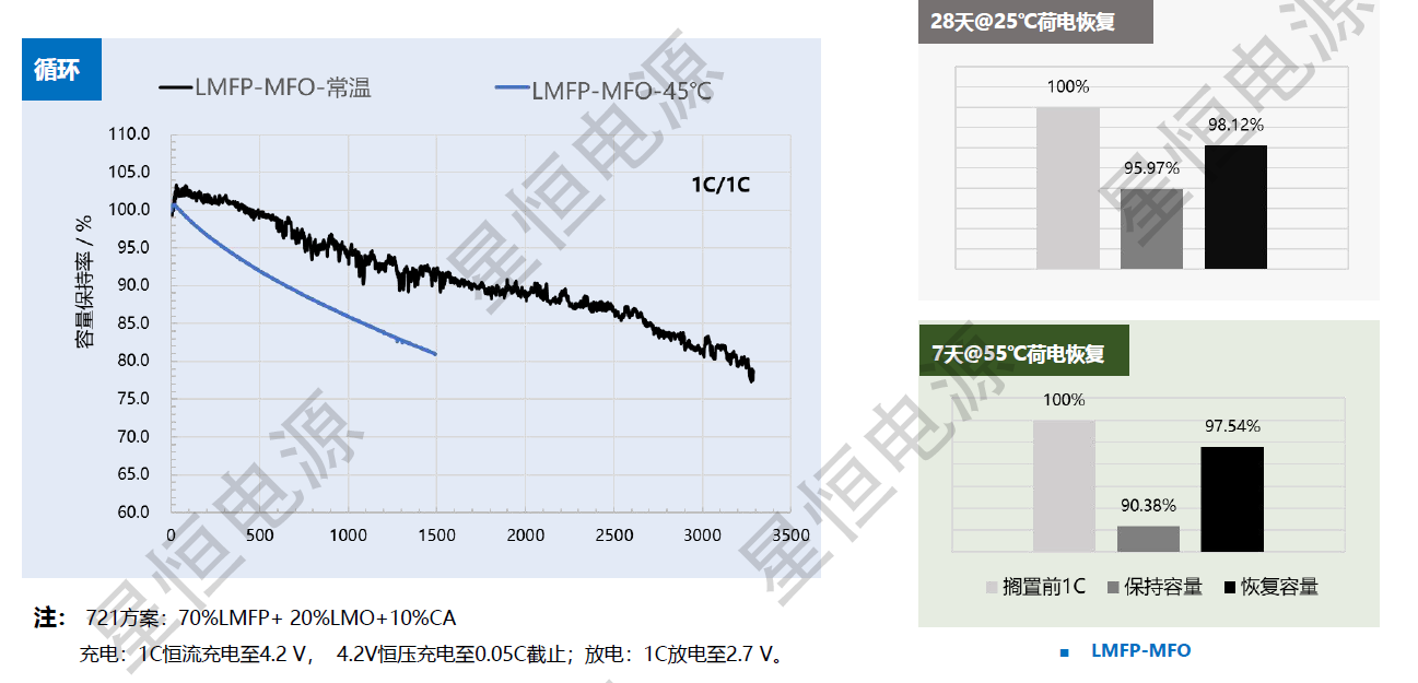 通过多重实验对比可得,第四代锰基电池(70%LMO+30%LMFP)厚涂,增大能量密度后,循环仍优于对标样;高温搁置优于对标样(对标样高温保持89-93%,恢复92-95%)。