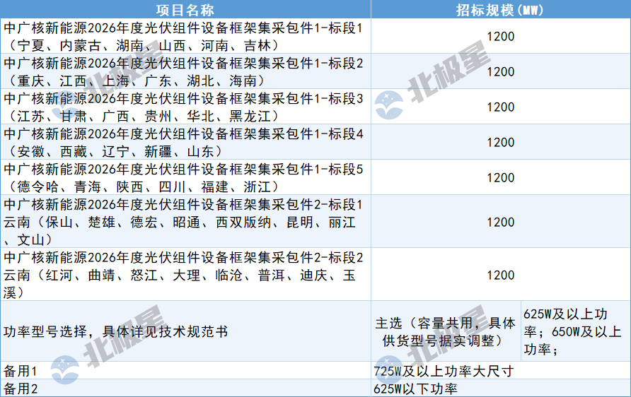 4月24日,中广核新能源2026年度光伏组件设备框架集采招标公告发布。招标公告显示,本招标项目划分为两个包件7标段,每个标段招标容量1.2GW,合计8.4GW。