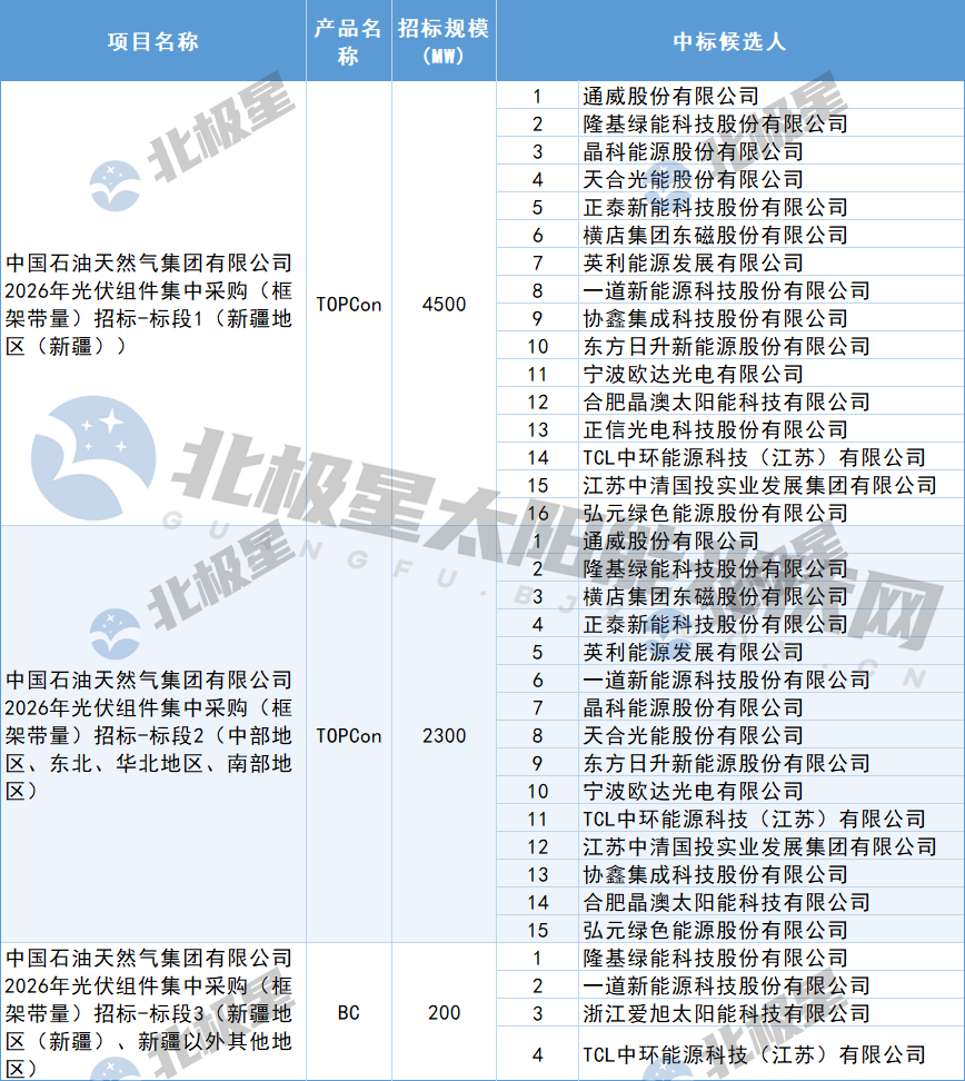 4月24日,中国石油天然气集团有限公司2026年光伏组件集中采购(框架带量)中标候选人公示,共计17家企业入围:通威股份有限公司、隆基绿能科技股份有限公司、晶科能源股份有限公司、天合光能股份有限公司、正泰新能科技股份有限公司、横店集团东磁股份有限公司、英利能源发展有限公司、一道新能源科技股份有限公司、协鑫集成科技股份有限公司、东方日升新能源股份有限公司、宁波欧达光电有限公司、合肥晶澳太阳能科技有限公司、正信光电科技股份有限公司、TCL中环能源科技(江苏)有限公司、江苏中清国投实业发展集团有限公司、弘元绿色能源股份有限公司、浙江爱旭太阳能科技有限公司。