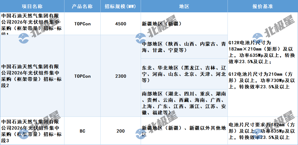 招标公告显示,本招标项目为中国石油天然气集团有限公司2026年光伏组件集中采购(框架带量),招标人为中国石油天然气集团有限公司,招标项目资金来自中国石油天然气集团有限公司,出资比例为100%自筹。该项目已具备招标条件,现对2026年光伏组件采购进行库内公开招标。