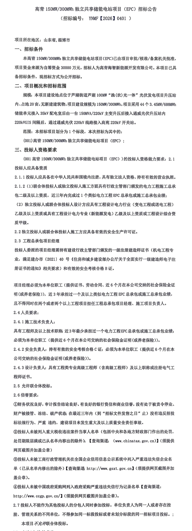 北极星储能网讯:2026年4月24日,山东省高青150MW/300MWh独立共享储能电站项目EPC发布招标公告,项目资金来源为自筹资金30000万元,合单价1元/Wh。