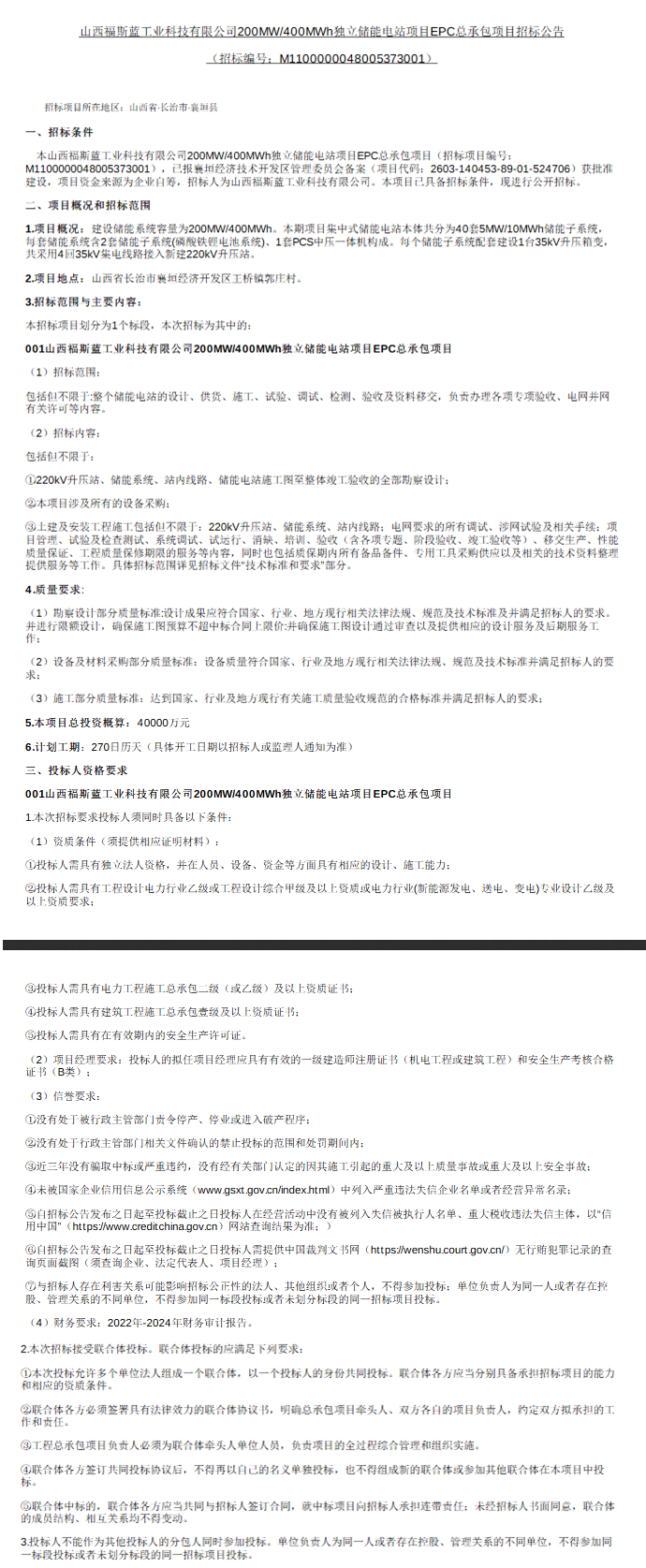 北极星储能网获悉,4月24日,山西福斯蓝工业科技有限公司发布招标公告,对其投资的200MW/400MWh独立储能电站项目进行EPC总承包公开招标。