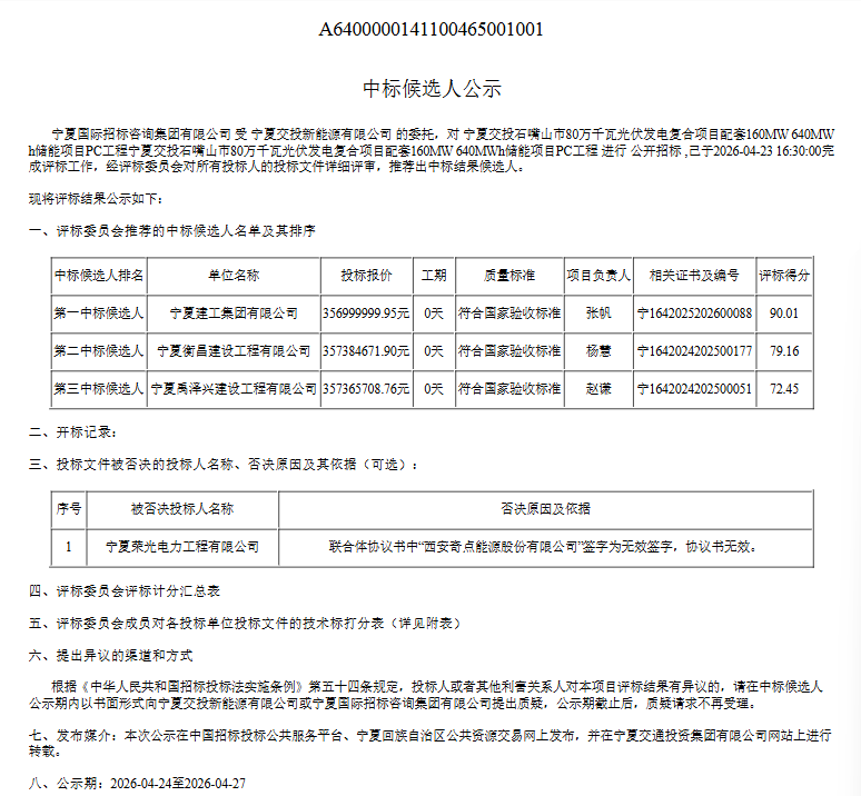 北极星储能网获悉,4月24日,宁夏交投石嘴山市80万千瓦光伏发电复合项目配套160MW/640MWh储能工程EPC总承包中标候选人公示。