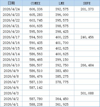 以下为2026年4月以来三大交易所铜库存数据:(单位:吨)