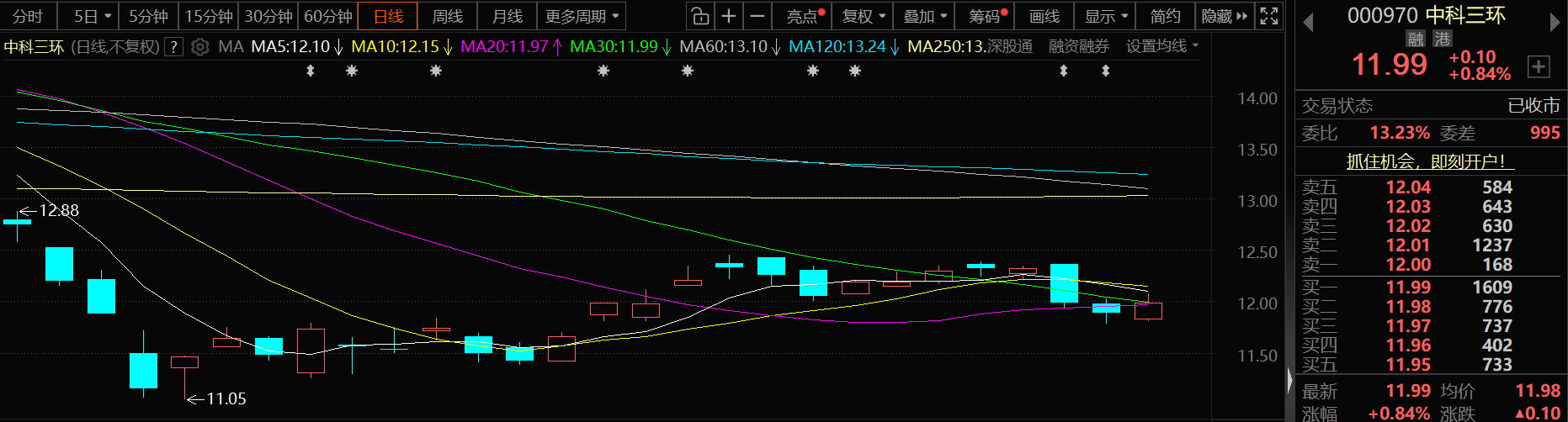 4月27日,中科三环股价出现上涨,截至27日收盘,中科三环股价涨0.84%,报11.99元/股。