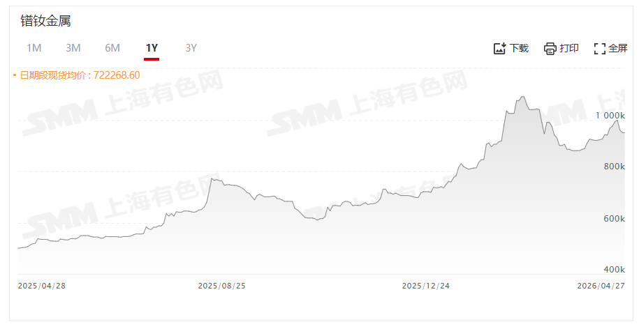 据SMM最新的报价显示:4月27日,镨钕金属的价格为940000~960000元/吨,其均价为950000元/吨,较前一交易日持平。